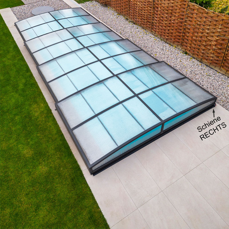 Dank einer Laufschienenverlängerung können Sie bei Bedarf die Sydney Poolüberdachung auch außerhalb der Pooloberfläche lagern. Somit steht Ihnen auch die komplette Poolfläche für eine Poolparty o.ä. zur Verfügung. Standardmäßig gibt es die Schienenverlängerung in den Längen 250, 280 und 323 cm. Bei diesem flachen Überdachungsmodell wird vom Hersteller empfohlen eine Laufschienenverlängerung mitzubestellen.