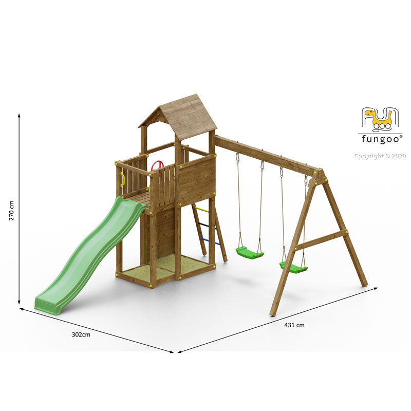 Produktinformationen "Fungoo Spielturm Boomer3 | Doppelschaukel | Sandkasten | Rutsche"
