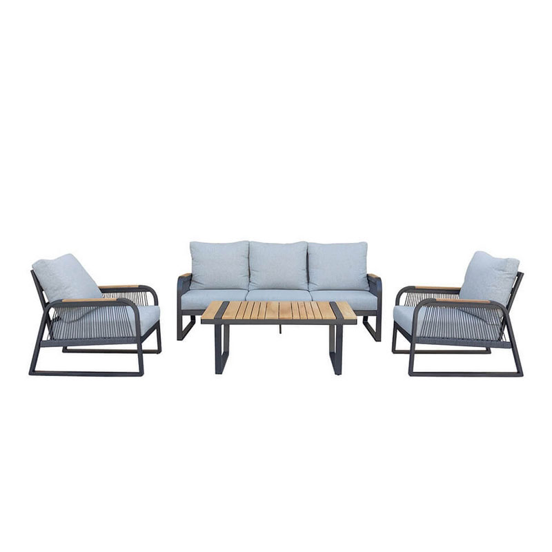 Erleben Sie mit der Gartenlounge Maraba einen Rückzugsort, der modernes Design und maximale Langlebigkeit vereint. Diese Lounge ist weit mehr als eine Sitzgelegenheit; sie ist ein Design-Highlight für Ihre Terrasse oder Ihren Garten. Das schwarze Aluminiumgestell bildet einen markanten Kontrast zu den hellgrauen Polstern und der stilvollen Seilbespannung, was der Gruppe eine unverwechselbare, elegante Leichtigkeit verleiht.