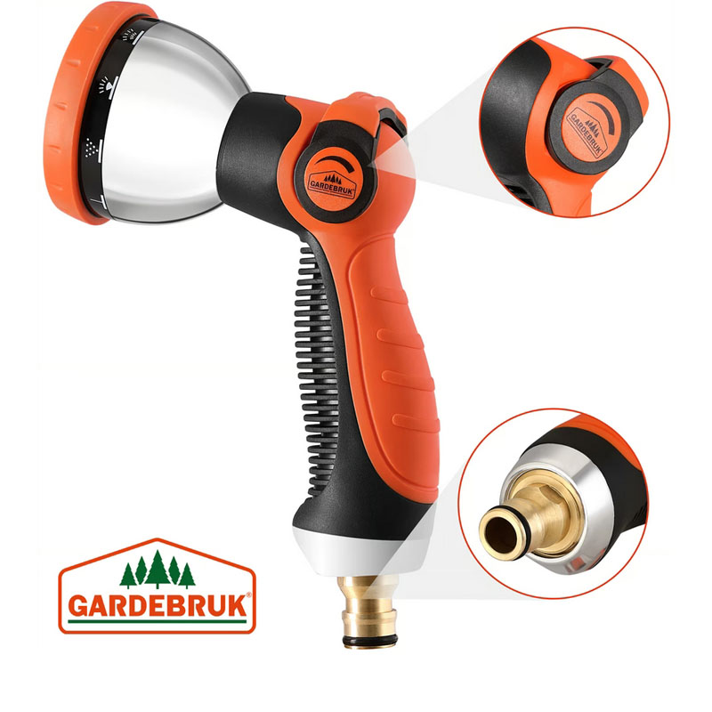 Der Sprühkopf aus schlagfestem ABS mit edlem Chromlook bietet Ihnen 10 verschiedene Sprühfunktionen, darunter eine Druckregulierung und eine praktische Feststellfunktion für schonendes Gießen empfindlicher Pflanzen. Der optimierte Handgriff mit Antirutschbeschichtung sorgt zudem für einen perfekten Halt.