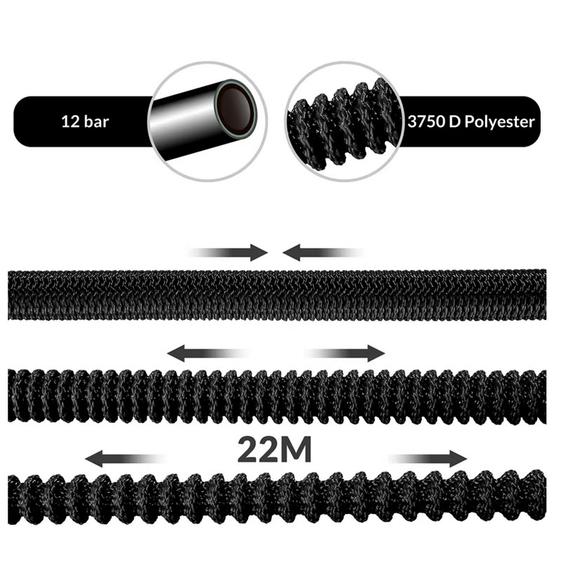 Der GARDEBRUK® Flexschlauch ist die ideale Lösung zum Bewässern Ihres Gartens. Er eignet sich ebenfalls hervorragend zum Reinigen von hartnäckigen Verschmutzungen in der Heimwerkstatt oder für die Autowäsche. Mit seinem robusten Design aus 3.750D x 3.750D Polyester und einem 3-fach Latexkern hält dieser Schlauch einem Wasserdruck von bis zu 12 bar stand und gewährleistet eine besonders lange Lebensdauer.