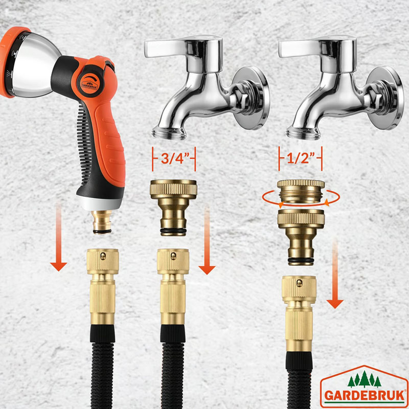 Mit den unverwüstlichen, nicht rostenden Voll-Messing-Adaptern können Sie den Schlauch einfach von ½ auf ¾ Zoll erweitern, um ihn überall anzuschließen. Im Lieferumfang sind zusätzlich zwei Gummidichtungen als Ersatzteil enthalten.