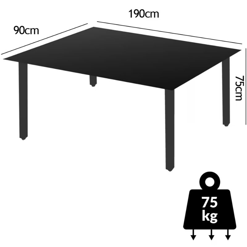 Schaffen Sie einen stilvollen Mittelpunkt auf Ihrer Terrasse oder in Ihrem Garten. Der Gartentisch Bern besticht durch seinen klaren Kontrast zwischen dem silbernen Aluminiumrahmen und der eleganten, schwarzen Glasoberfläche. Mit einer Breite von 90 cm und einer Länge von 190 cm ist er ideal dimensioniert, um bequem bis zu acht Personen Platz zu bieten – perfekt für Grillabende oder das Frühstück im Freien.