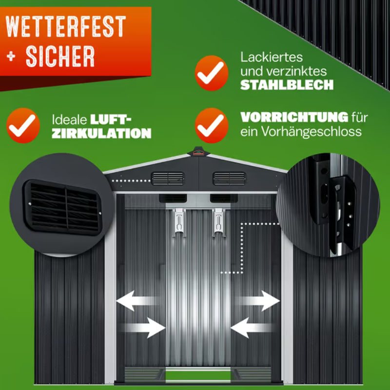 Das Gerätehaus verfügt über eine zweigeteilte Schiebetür, die einen mühelosen Zugang ermöglicht. Zusätzlich sorgen vier Belüftungsöffnungen im Oberbereich (jeweils zwei vorne und hinten) für eine optimale Luftzirkulation, was hilft, Feuchtigkeit zu reduzieren und eine frische Umgebung zu schaffen.