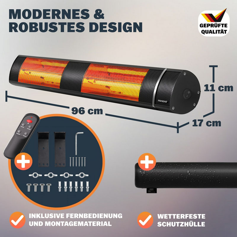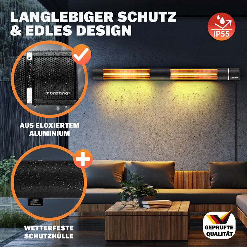 Wenn Standardlösungen nicht mehr ausreichen, kommt der MZH3000 ins Spiel. Mit einer beeindruckenden Leistung von 3.000 Watt verwandelt dieser Infrarotstrahler selbst weitläufige Außenbereiche in Sekunden in eine behagliche Wärmezone. Erhältlich in elegantem Silber oder zeitlosem Schwarz, fügt sich das Gehäuse aus eloxiertem Aluminium-Druckguss nahtlos in moderne Architektur ein.