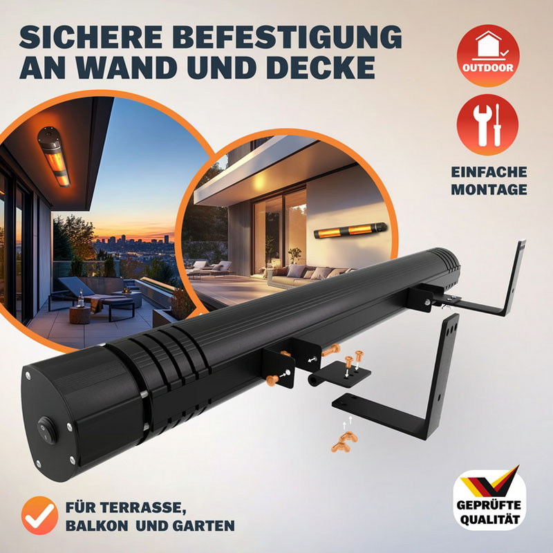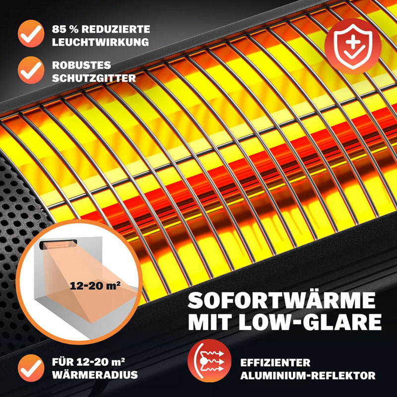 • Weitwinkel-Reflektor: Der hocheffiziente Aluminium-Reflektor sorgt für eine extrem breite und gleichmäßige Wärmeabstrahlung.