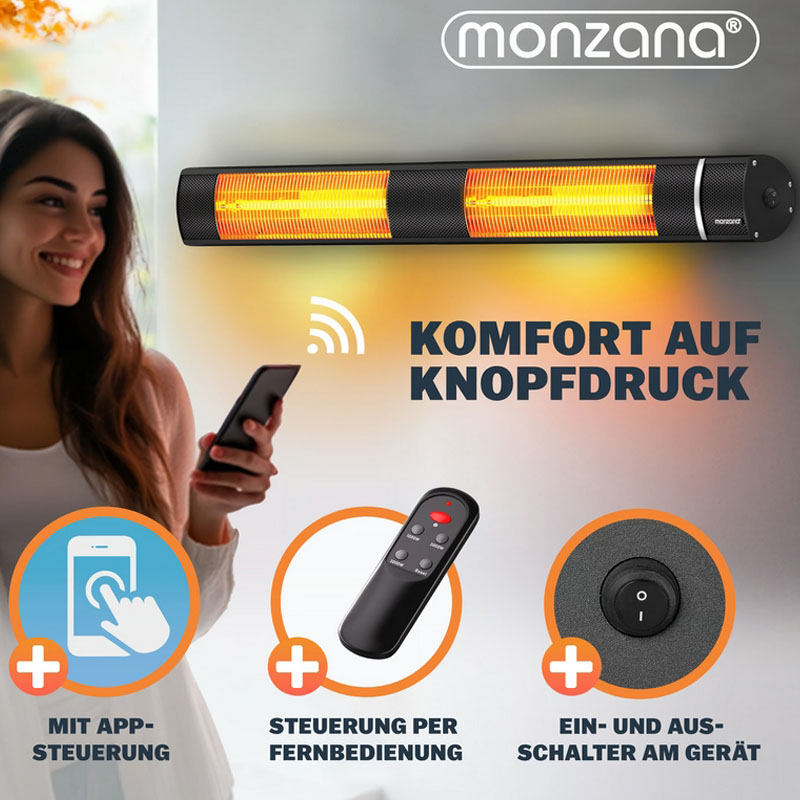 • App- & Fernbedienung: Wählen Sie die drei Wärmestufen (1.000 W, 2.000 W, 3.000 W) bequem per Smartphone-App oder klassisch via Fernbedienung.