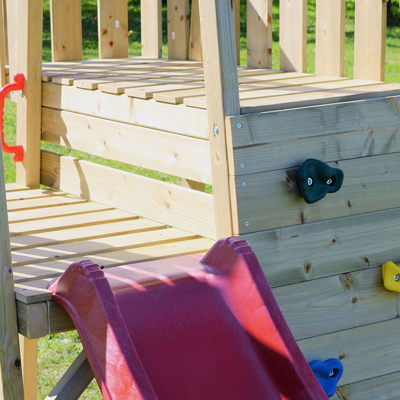 Der Spielturm Flamingo ist ein echtes Multitalent, das die Kreativität und Motorik Ihrer Kinder fördert. Ob beim Erklimmen der Kletterwand mit Bouldergriffen, beim rasanten Rutschen auf der roten Rutsche oder beim entspannten Schaukeln auf den 2 Schaukeln – hier kommt garantiert keine Langeweile auf.