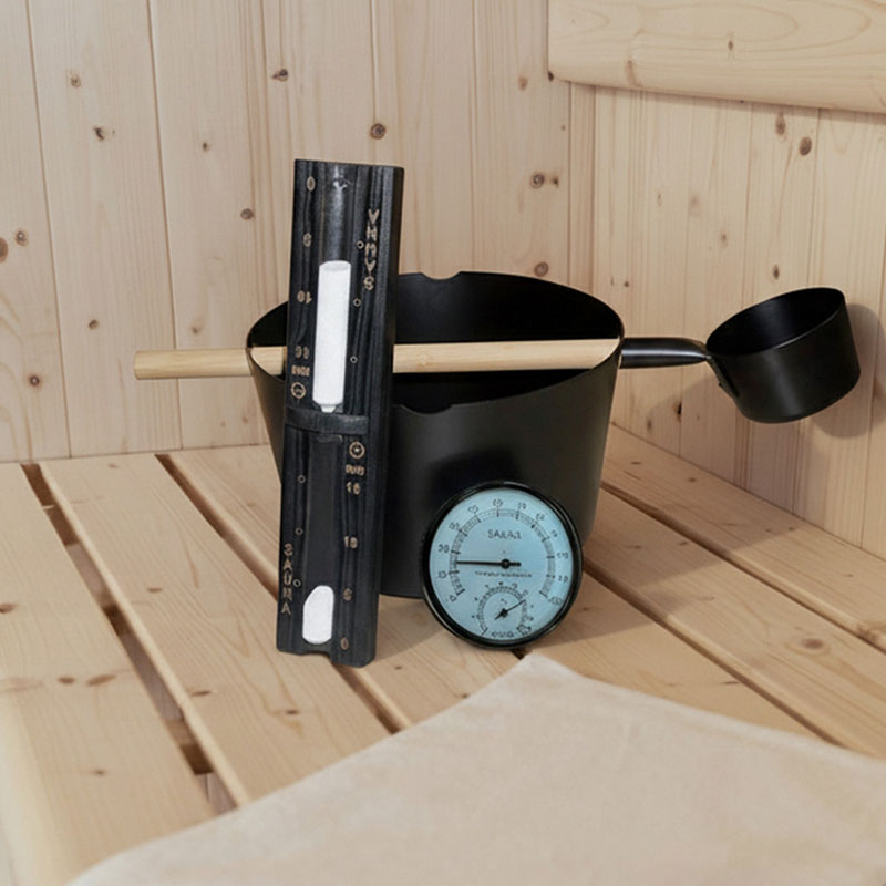 - Zubehör komplett (Saunasteine, Kelch, Kelle, Sanduhr und Thermometer)