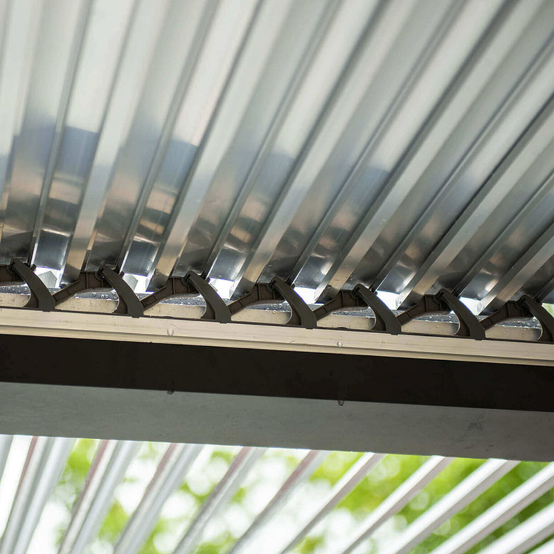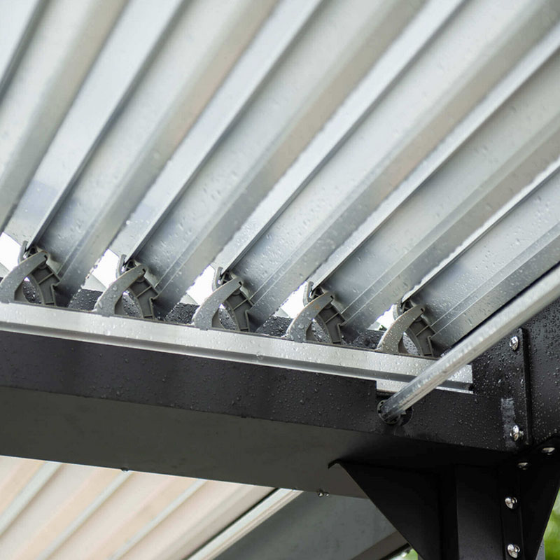 Die hochwertigen Aluminiumlamellen passen perfekt zur Überdachung und schaffen angenehmen Schatten sowie mediterranes Flair in Ihrem Garten unter dem Pavillon.