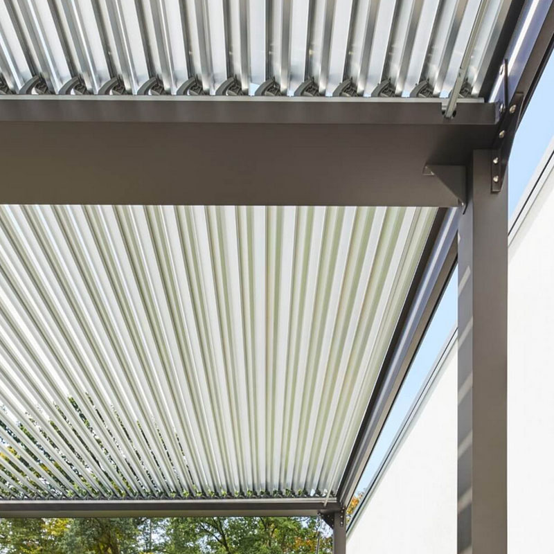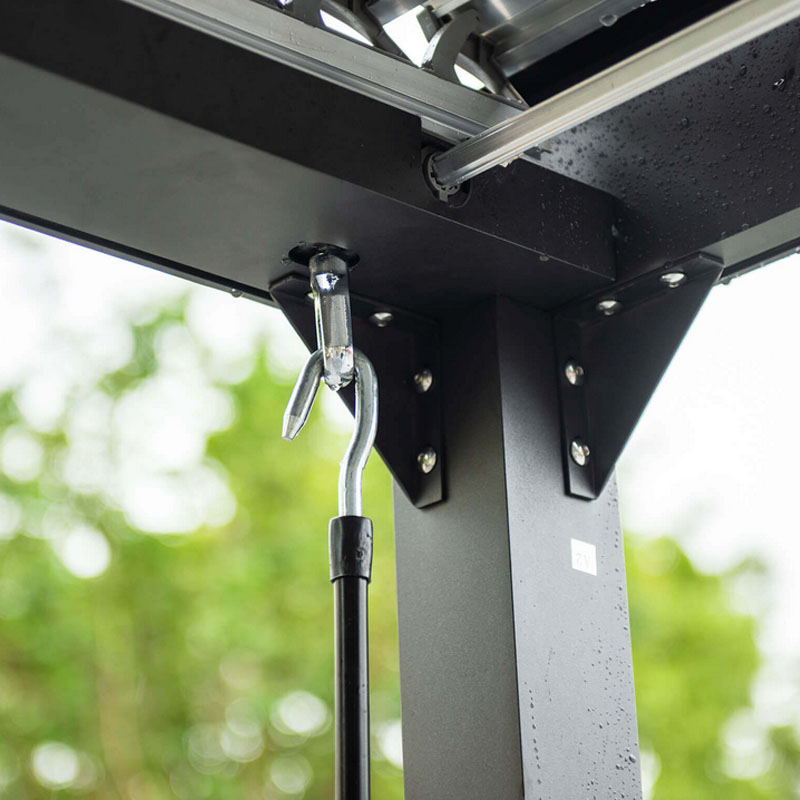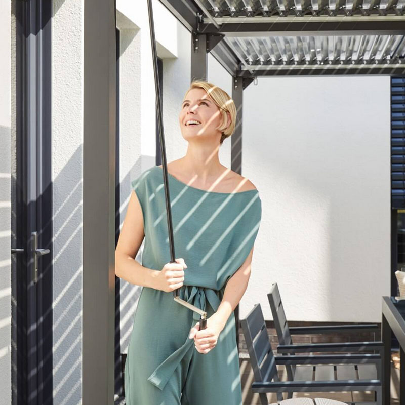 Die Besonderheit dieses Pavillons liegt darin, dass Sie bei allen Wetterbedingungen Zeit auf der Terrasse oder im Garten verbringen können. Im Sommer können Sie UV-Strahlung abschirmen oder den Rauch beim Barbecue entweichen lassen – öffnen und schließen Sie das Dach nach Bedarf, dank der einfachen Handkurbelbedienung.