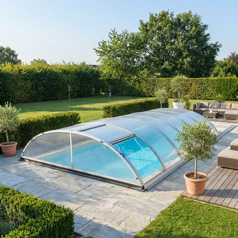 Das Modell Compact K gehört zu den flacheren Poolüberdachungen. Die Bogenform verleiht der flachen Poolüberdachung eine sehr gute Stabilität. Jedes Segment der Poolüberdachung ist einzeln, in beide Richtungen verschiebbar. Die Poolüberdachung verfügt über eine abnehmbare Vorderwand.