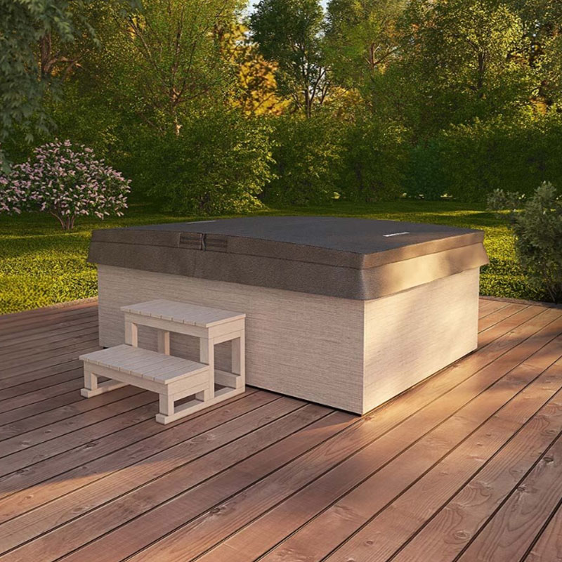 Der Whirlpool kann mit einer hochwertigen Thermoabdeckung und einer praktischen Treppe ausgestattet werden (als Variante erhältlich), die den Einstieg erleichtert und die Wärme optimal isoliert.