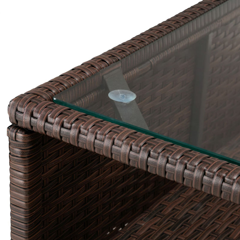 Ein besonderes Highlight der Lounge ist die geschützte Ablage unter der Tischplatte, ideal zum Verstauen von Büchern, Zeitschriften und anderen Gegenständen. Die große 5 mm Sicherheits-Glasplatte kann einfach vom Tisch abgenommen werden und ist mit Saugnäpfen gesichert, um ein Verrutschen zu verhindern. Der Tisch hat eine Belastbarkeit von bis zu 75 kg.