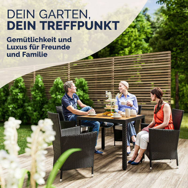 Egal ob ein gemütliches Frühstück zu zweit oder ein Spieleabend zu viert: Die 5-teilige Sitzgruppe Korfu bietet den perfekten Rahmen. Das Set besteht aus einem quadratischen Tisch (90 x 90 cm) und vier komfortablen Sesseln. Die Kombination aus tiefschwarzem Geflecht und der warmen Maserung des Akazienholzes verleiht dieser Garnitur eine zeitlose Eleganz, die jeden Außenbereich aufwertet.