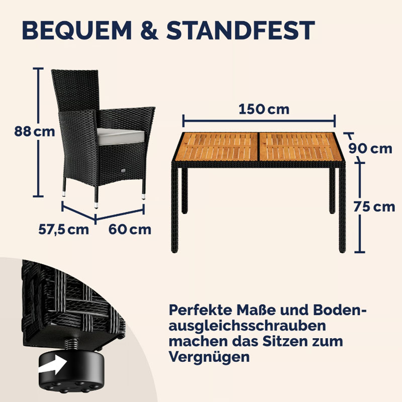 - Immer im Gleichgewicht: Sowohl der Tisch als auch die Stühle verfügen über höhenverstellbare Ausgleichsschrauben, um Unebenheiten im Boden (z. B. auf Rasen oder Steinplatten) perfekt auszugleichen.