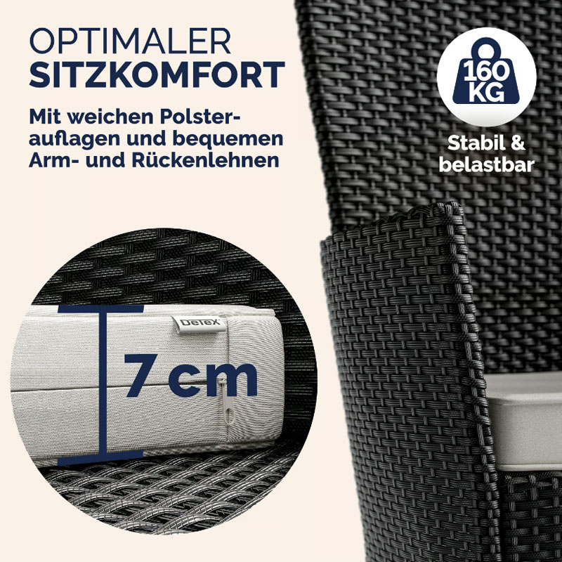 - Stabile Basis: Ein pulverbeschichtetes Stahlgestell bildet das Rückgrat der Möbel. Mit einer Belastbarkeit von 160 kg pro Stuhl ist die Garnitur überdurchschnittlich robust.