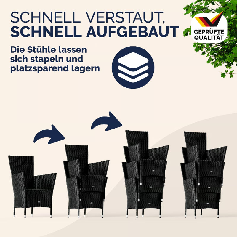 - Platzsparende Lösung: Die Stühle lassen sich bei Bedarf einfach und sicher stapeln, um im Winter oder bei Nichtgebrauch Platz zu sparen.