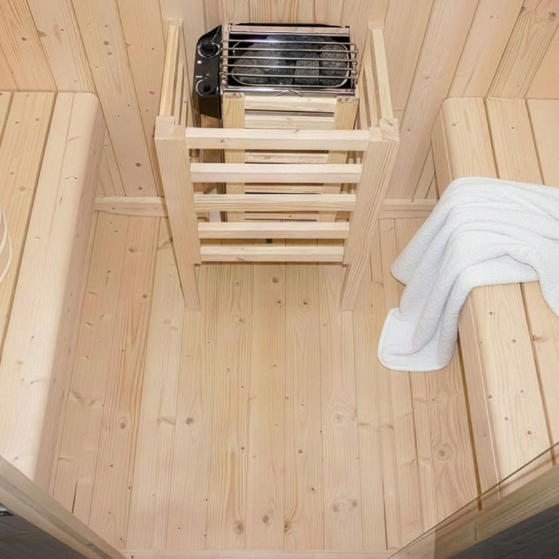 Der inkludierte 3,6 kW Saunaofen sorgt für eine schnelle und effiziente Aufheizung. Mit dieser Heizleistung genießen Sie das angenehme Saunaerlebnis. Die optimale Temperaturverteilung wird durch die spezielle Fassform unterstützt, die die Luft- und Wärmezirkulation maximiert.