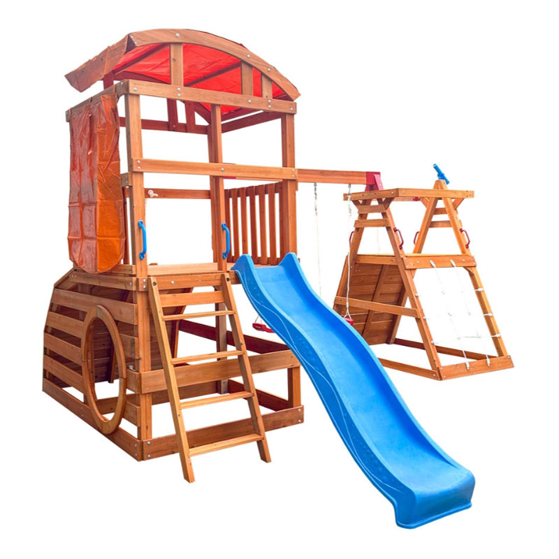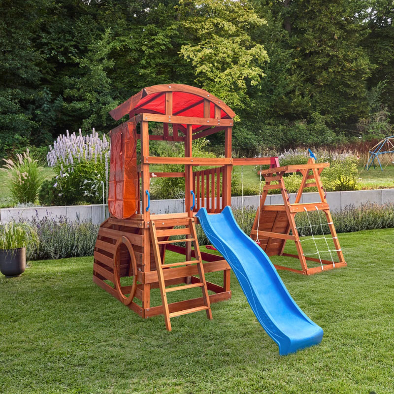 Gefertigt aus 2,4 cm starkem Tannenholz, überzeugt der Spielturm durch seine maximale Stabilität und Langlebigkeit. Die geprüfte Qualität und sorgfältige Verarbeitung garantieren ein sicheres Spielerlebnis für Ihre Kinder. Das spezielle Holz ist wetterfest und sorgt dafür, dass der Spielturm auch bei verschiedenen Witterungsbedingungen im Freien bleibt.