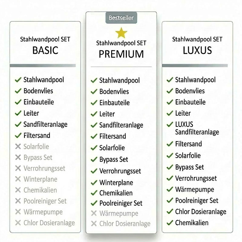 Warum kompliziert, wenn es auch einfach geht? Das Stahlwandpool Premium Set ist das Ergebnis jahrelanger Erfahrung und Kundenfeedback. Es enthält nicht nur das hochwertige Becken, sondern die komplette technische Infrastruktur, die Sie für einen reibungslosen Betrieb und maximalen Badekomfort benötigen.
