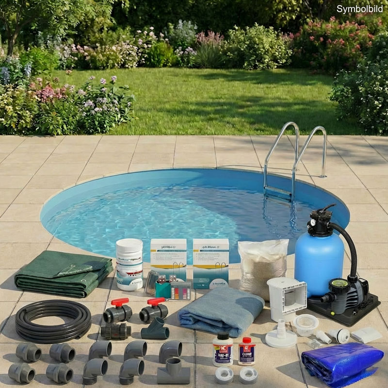 - Starter-Paket Chemie & Reinigung: Damit das Wasser vom ersten Tag an kristallklar bleibt, legen wir ein Set mit Basis-Chemikalien und ein Reinigungs-Kit oben drauf.