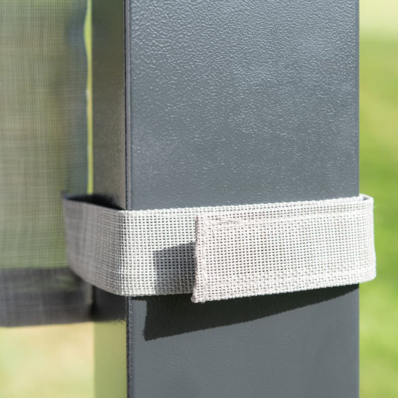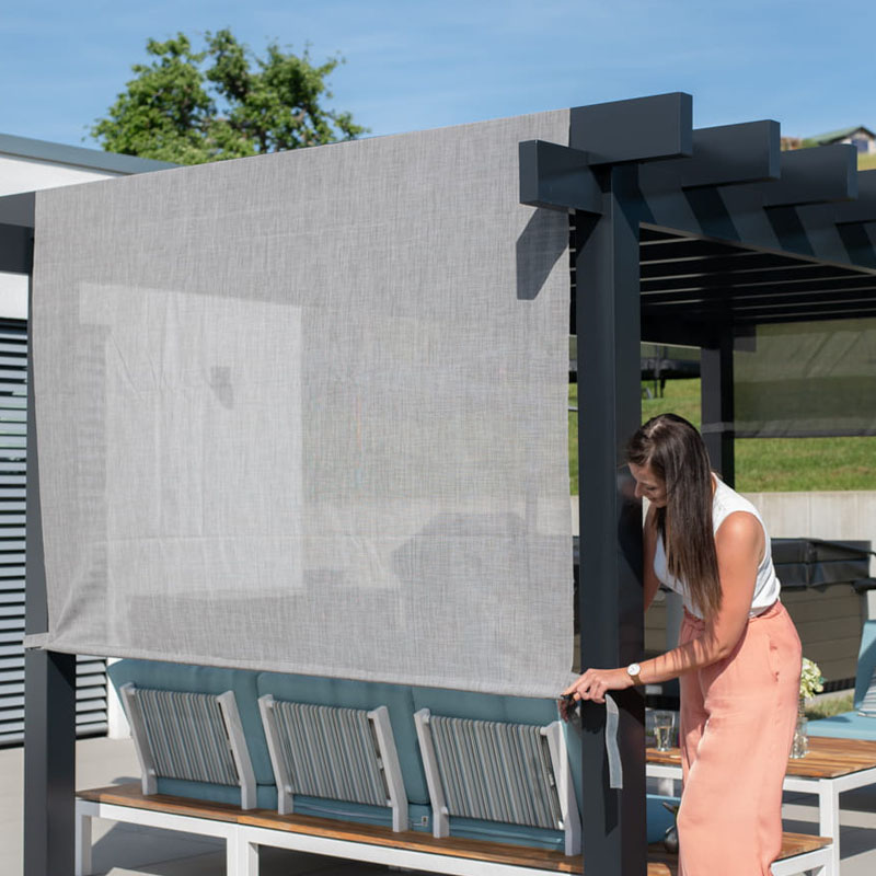 - Modernes Design: Die Kombination aus dem anthrazitfarbenen Rahmen und dem grauen Textildach fügt sich nahtlos in moderne Gartenlandschaften ein.