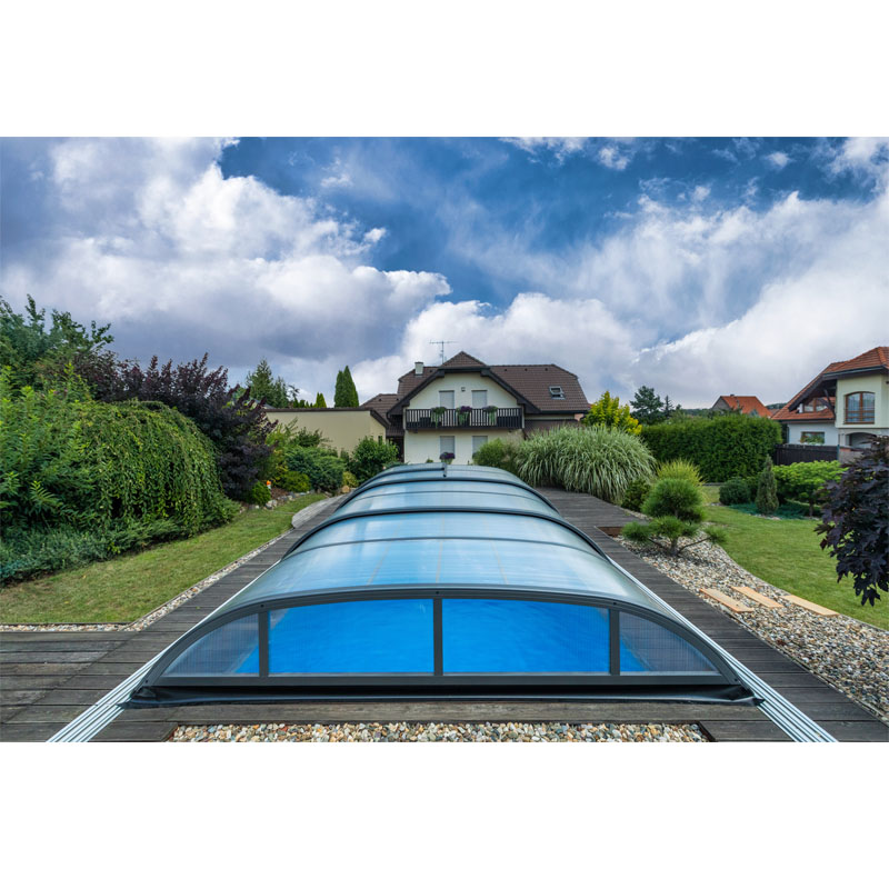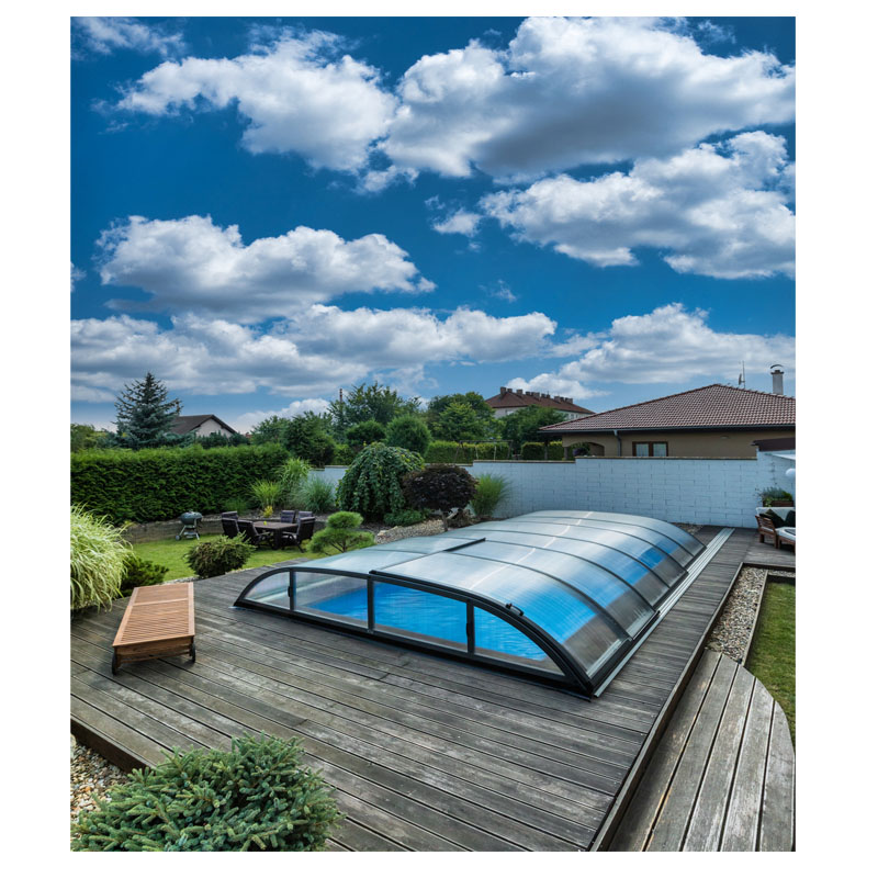 Die Albixon Poolüberdachung Dallas A gehört mit seiner flachen Bogenform zu einen der bekanntesten Poolüberdachungen auf dem Markt. Sie verleiht dank Ihrem schönen Design und den qualitativ hochwertigen Einbauteilen jedem Pool ein edles Aussehen. Ihre durch einen Halbkreis inspirierte Bogenkonstruktion verleiht der Dallas Poolüberdachung ein noch nie dagewesene statische Beständigkeit gegenüber Witterungseinflüssen und Schneelast.