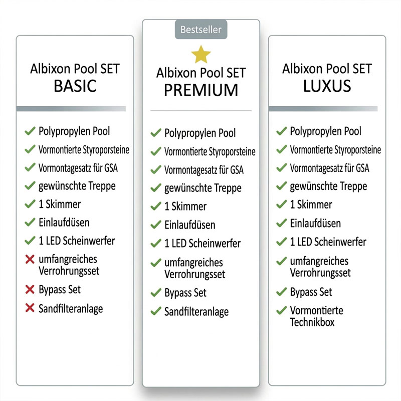Träumen Sie vom eigenen Pool, scheuen aber den immensen Bauaufwand? Der Albixon QBIG Benefit Plus ist die Antwort. Dieses Komplettset kombiniert modernste Werkstofftechnik (Albistone®) mit einer intelligenten Thermoisolierung, die Ihre Baukosten und die Montagezeit radikal reduziert. Ein echtes Sorglos-Paket für anspruchsvolle Gartenbesitzer.