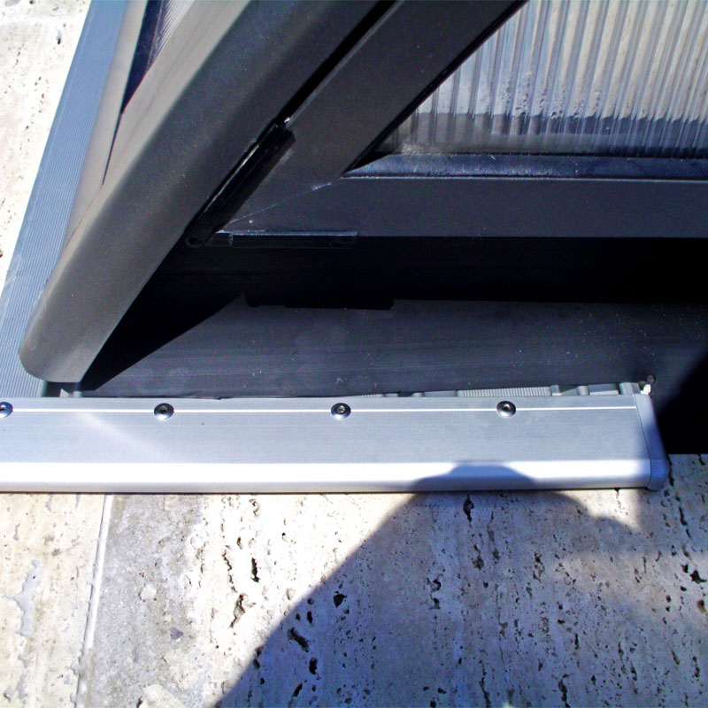 Die Laufschienen sind mit einer Höhe von 14 mm besonders flach und zeitgleich auch begehbar.Mit der kostenlosen Laufschienenverlängerung 2,25 m können Sie bei Bedarf die Poolüberdachung auch komplett außerhalb des Swimmingpool-Bereichs lagern.