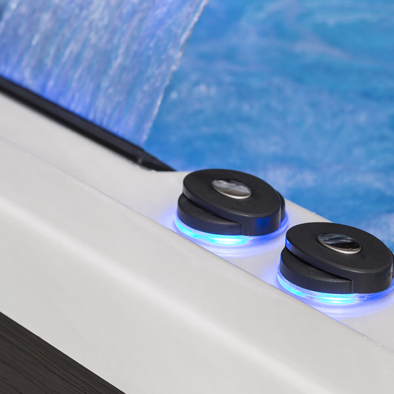 Die LED-Beleuchtung im AWT IN-403 setzt neue Maßstäbe in der Atmosphäre. Mit insgesamt 40 Lampen, die unter den Kopfstützen, im Filterbereich und im gesamten Pool integriert sind, schaffen Sie das perfekte Ambiente für jede Gelegenheit. Der beleuchtete Wasserfall und die dezente Schürzenbeleuchtung sorgen für eine magische Stimmung, ob bei romantischen Abenden oder geselligen Feiern mit Freunden.