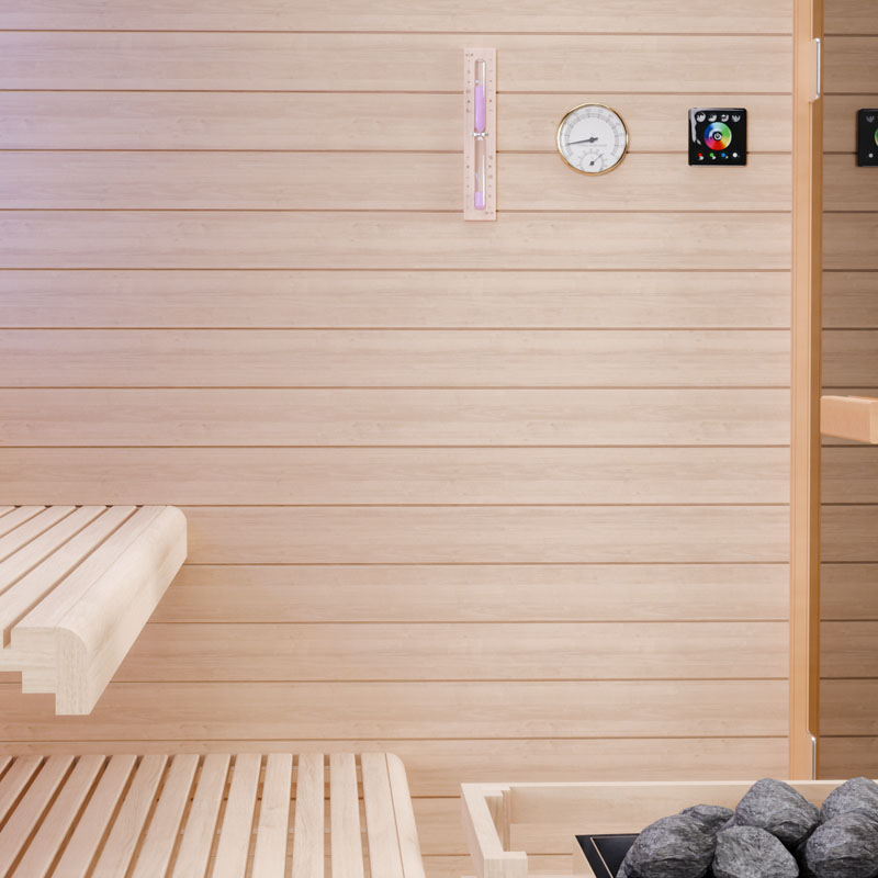 Die TOFINO Sauna besteht aus sorgfältig verarbeitetem Hemlock-Holz, das für seine Robustheit und gute Isolierung bekannt ist. Das Holz sorgt dafür, dass die Wärme effizient in der Kabine gehalten wird und bietet ein angenehmes Saunaklima. Die großzügige Glastür aus Sicherheitsglas und die Edelstahl-Scharniere verleihen der Sauna ein harmonisches und hochwertiges Design, das Ihren Wellness-Bereich optisch aufwertet.