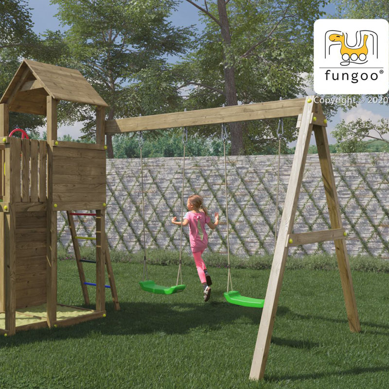 Fungoo Spielturm Boomer3 | Doppelschaukel | Sandkasten | Rutsche