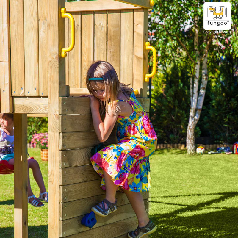 Der FUNGOO CAROL 3 Spielturm ist perfekt für Gärten, Freizeitgrundstücke und öffentliche Spielbereiche, wo Kinder aktiv spielen und ihre Abenteuerlust ausleben können. Verwandeln Sie Ihren Garten in ein echtes Spielparadies!