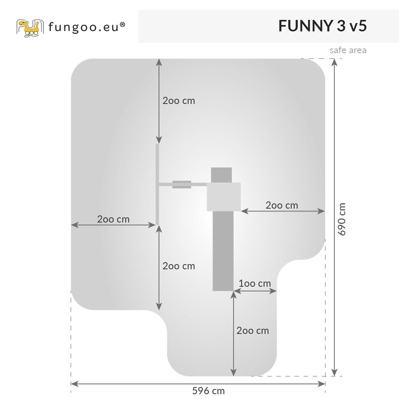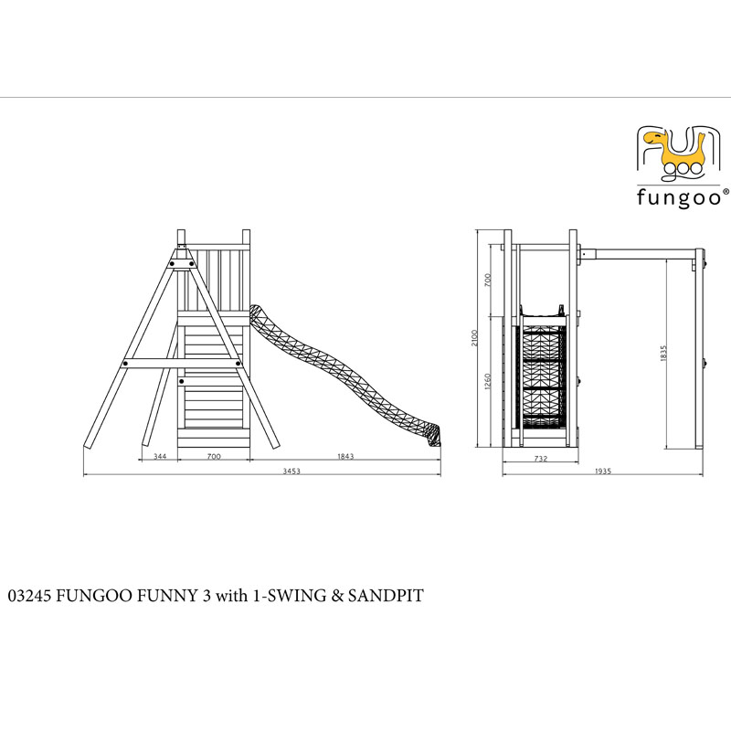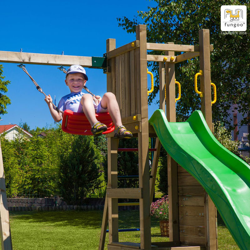 Der FUNGOO Funny 3 ist aus hochwertigem, wetterfest imprägniertem Nadelholz gefertigt, was Langlebigkeit und Sicherheit verspricht. Alle Metallteile sind mit Schutzabdeckungen versehen, sodass das Spielvergnügen unbeschwert erfolgen kann.
