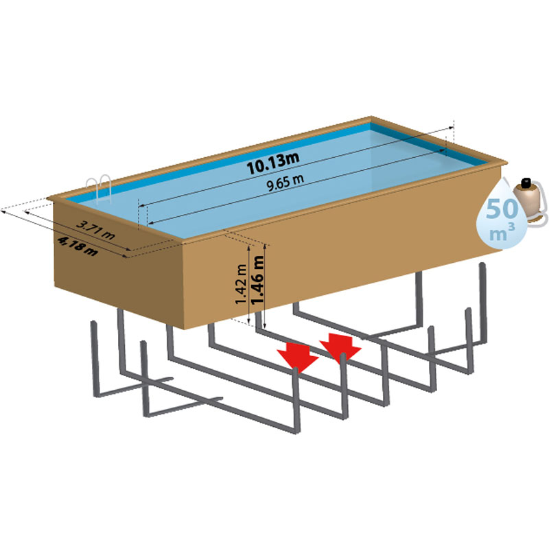 - Der Pool enthält Metallstützen die vor der Herstellung der Betonplatte installiert werden müssen (es ist daher notwendig den Pool vor dem Aufbau der Betonplatte zu erhalten)