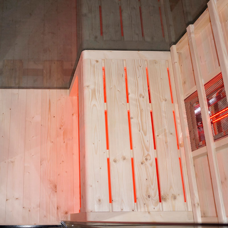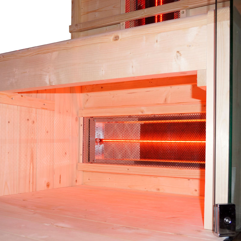Die Kabine ist mit 6 mm Sicherheitsglas ausgestattet, das sowohl für Sicherheit als auch für ein modernes Erscheinungsbild sorgt. Diese Glasfront ermöglicht einen offenen Blick nach außen, während Sie die wohltuende Wärme genießen.