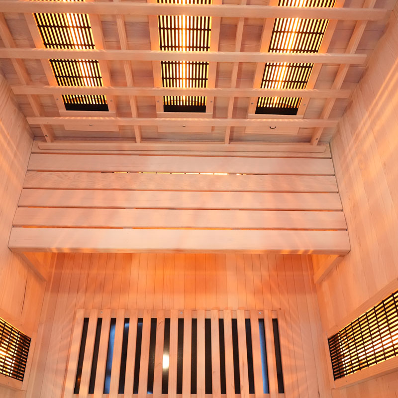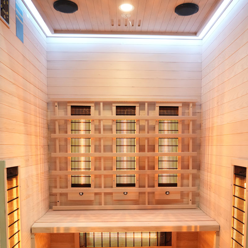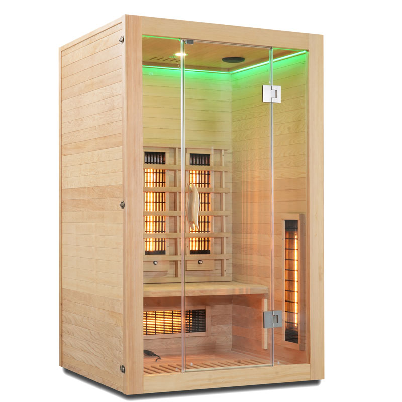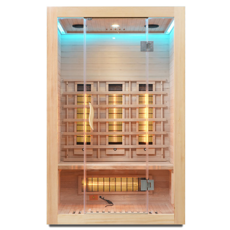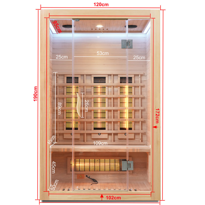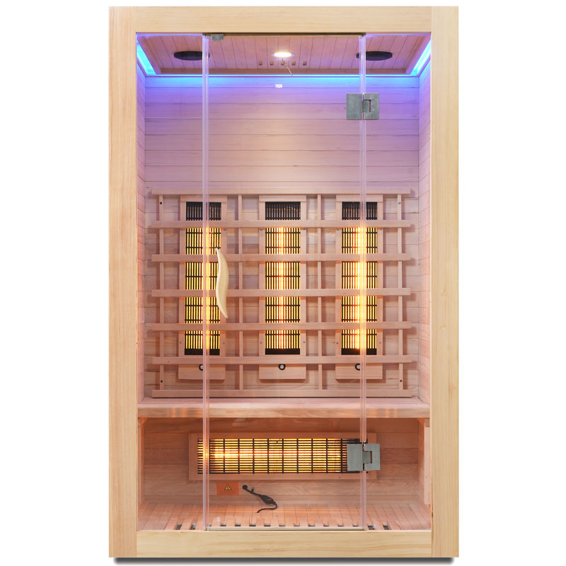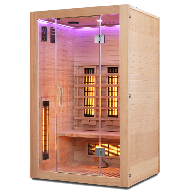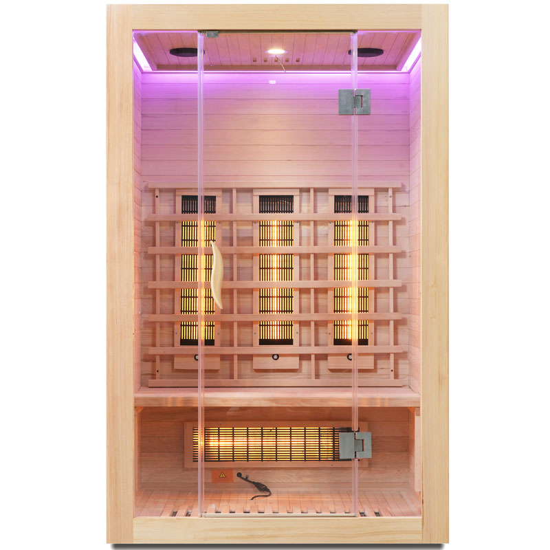 Die Infrarotsaunakabine beeindruckt nicht nur durch ihre technische Ausstattung, sondern auch durch ihr modernes Design. Die Tür und Front bestehen aus 8 mm Sicherheitsglas, während das Holz der Kabine aus hochwertigem Hemlock gefertigt ist. Ein elektronisches Bedienelement ermöglicht Ihnen eine unkomplizierte Steuerung der Funktionen.