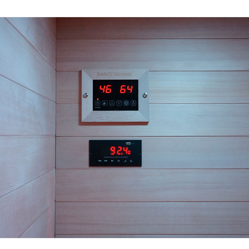 Das elektronische Bedienelement macht die Handhabung der Infrarotkabine besonders einfach. Genießen Sie Ihre Lieblingsmusik über den integrierten FM/MP3/Bluetooth-Player mit USB-A-Anschluss. Dank der zwei Lautsprecher wird Ihre Entspannung durch angenehme Klänge unterstützt, die eine harmonische Atmosphäre schaffen.