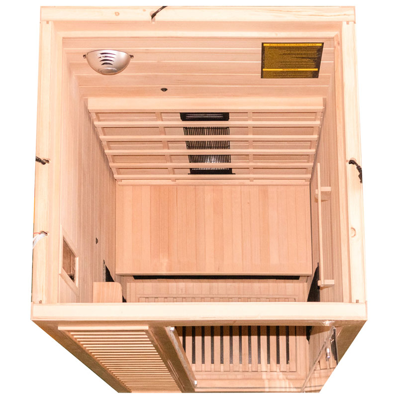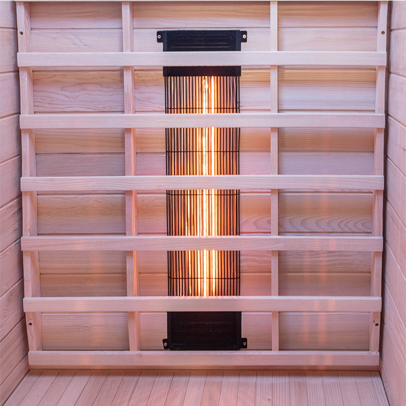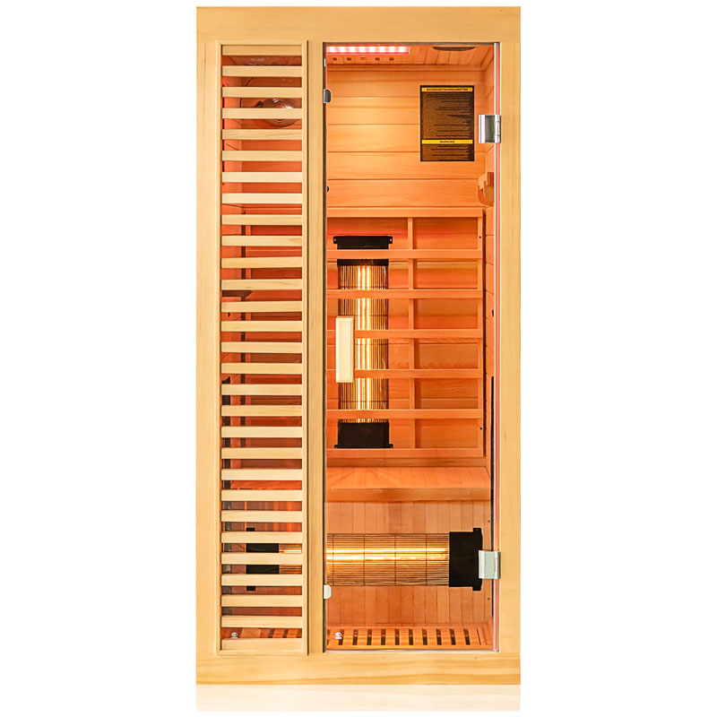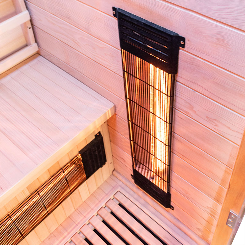 Infrarotsauna Hamlin 90 x 90 cm für 1 Person aus Hemlock Tannenholz mit Vollspektrum- und Karbonstrahler ausgestattet
