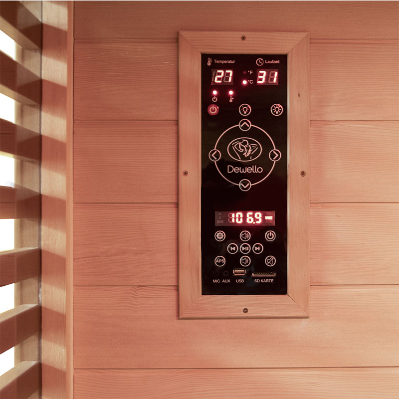 Die eingebaute Steuereinheit (Steuerung von innen) ermöglicht die zentrale Kontrolle von Beleuchtung, HiFi-System, Temperatur und Timer. Im Vergleich zu vielen anderen Geräten unterstützt unsere Kabine die direkte Wiedergabe von MP3-Dateien über USB Stick oder SD Karte. Die integrierten Lautsprecher in der Decke sorgen für einen klaren, kraftvollen Sound.