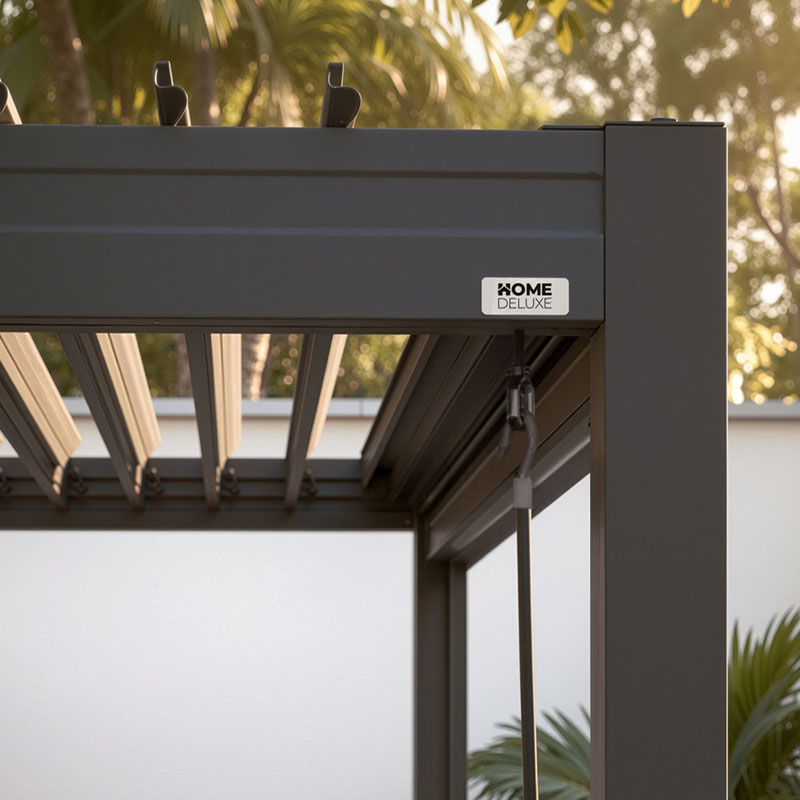 Verwandeln Sie Ihre Terrasse mit dem Lamellenpavillon ROVAS in eine moderne Wohlfühloase. Mit einer Grundfläche von 3 x 3 Metern bietet er den idealen Raum für Gartenmöbel, Lounges oder Ihren Essbereich. Das zeitlose Design in edlem Anthrazit macht ihn zum architektonischen Highlight in jedem Garten.