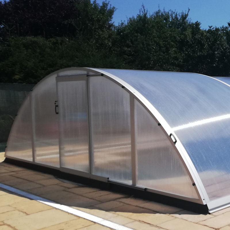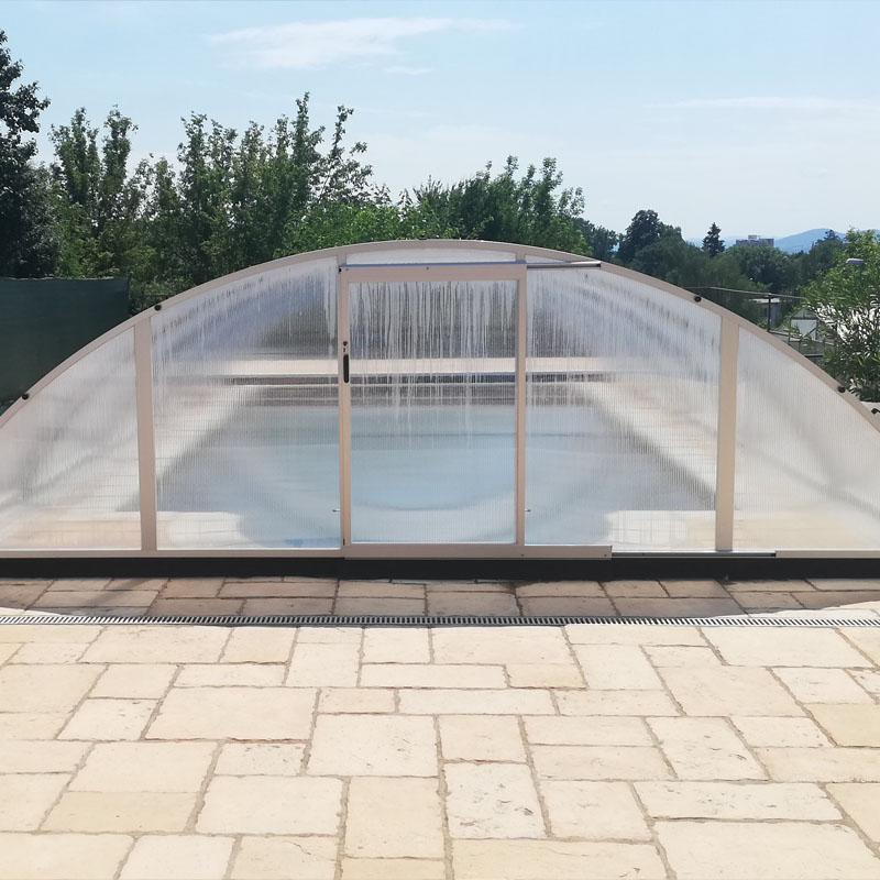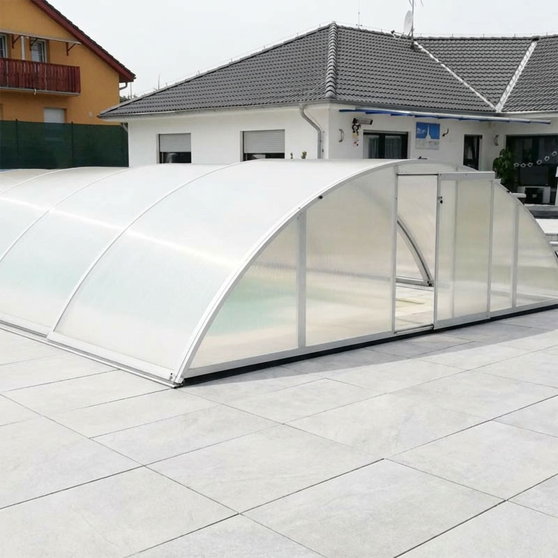 Die einzelnen Segmente der Trend Pool Halle sind beidseitig rollbar. Die Wand besteht aus durchsichtigem Polycarbonat-Doppelstegplatten 10 mm. Selbstverständlich ist sie UV-beständig.