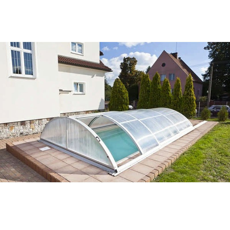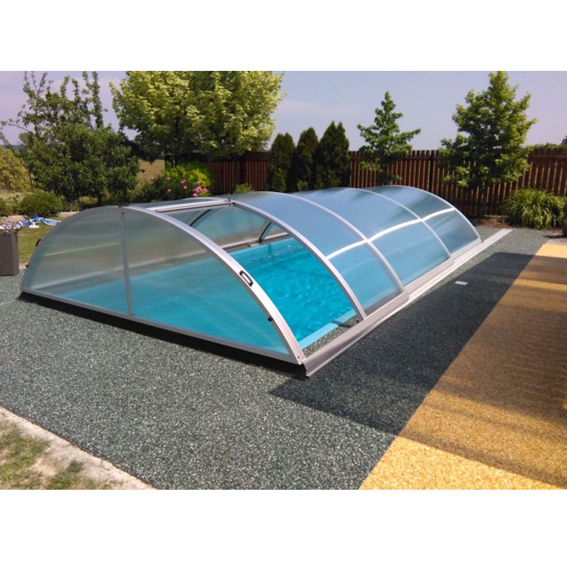 Die Serienproduktion Trend gehört zu den mittelhohen Mountfield Pool Überdachungen. Die Bogenform verleiht der Poolüberdachung eine sehr gute Stabilität. Jedes Segment der Poolüberdachung ist einzeln, in beide Richtungen verschiebbar. Die Poolüberdachung verfügt über eine abnehmbare Vorderwand.