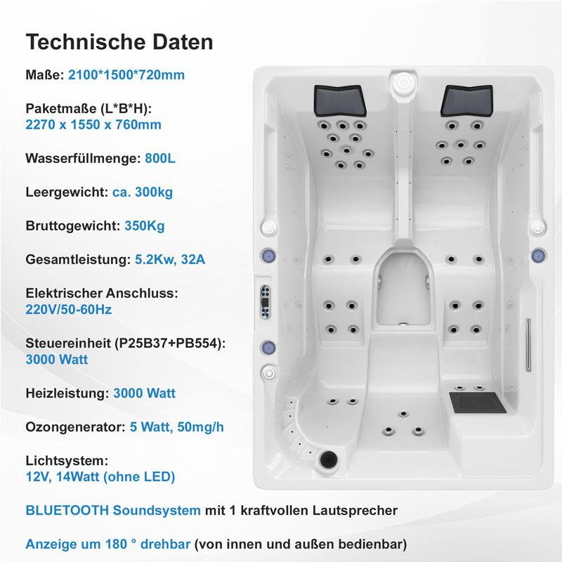 Dieser Outdoor Whirlpool ist die perfekte Lösung für alle, die sich nach Entspannung und Luxus sehnen. Die Kombination aus leistungsstarker Technik, hochwertiger Verarbeitung und stilvollem Design bietet ein Wellness-Erlebnis, das keine Wünsche offenlässt.