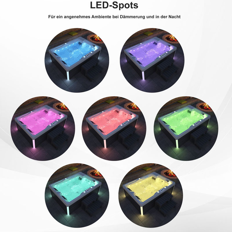 Die stimmungsvolle Beleuchtung, bestehend aus einem großen LED-Strahler und weiteren LEDs, schafft ein einzigartiges Ambiente. Kombiniert mit dem integrierten Wasserfalleinlauf wird jeder Moment im Whirlpool zu einem optischen und akustischen Highlight.