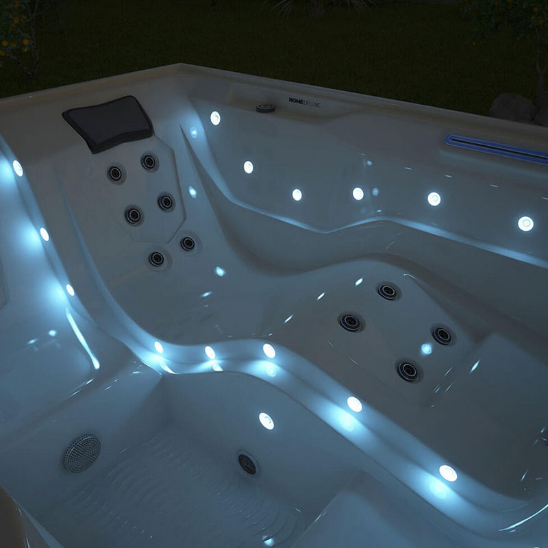 Der Whirlpool verzaubert mit 31 LEDs, darunter vier äußere LED-Lichtstreifen, die sanft die Umgebung erhellen. Die LED-Lichter im Boden und an den Innenwänden schaffen eine gemütliche Atmosphäre, ideal für entspannte Abende unter dem Sternenhimmel.