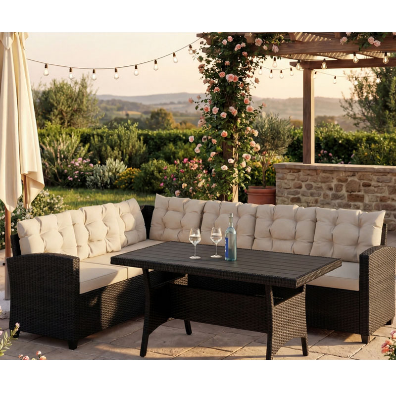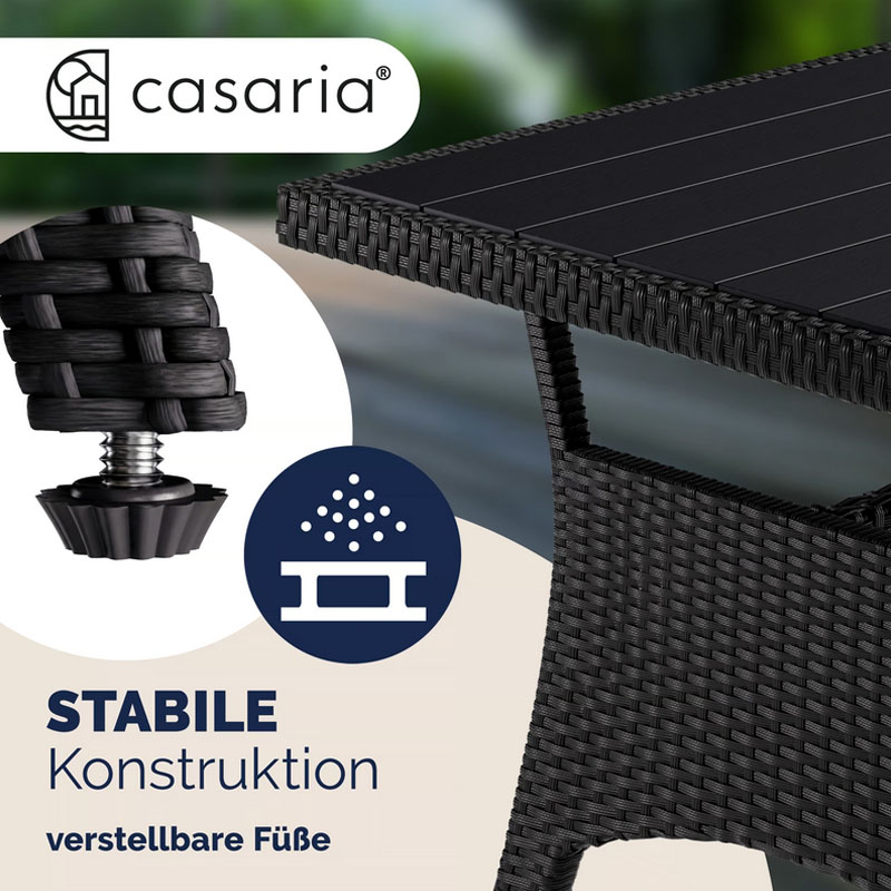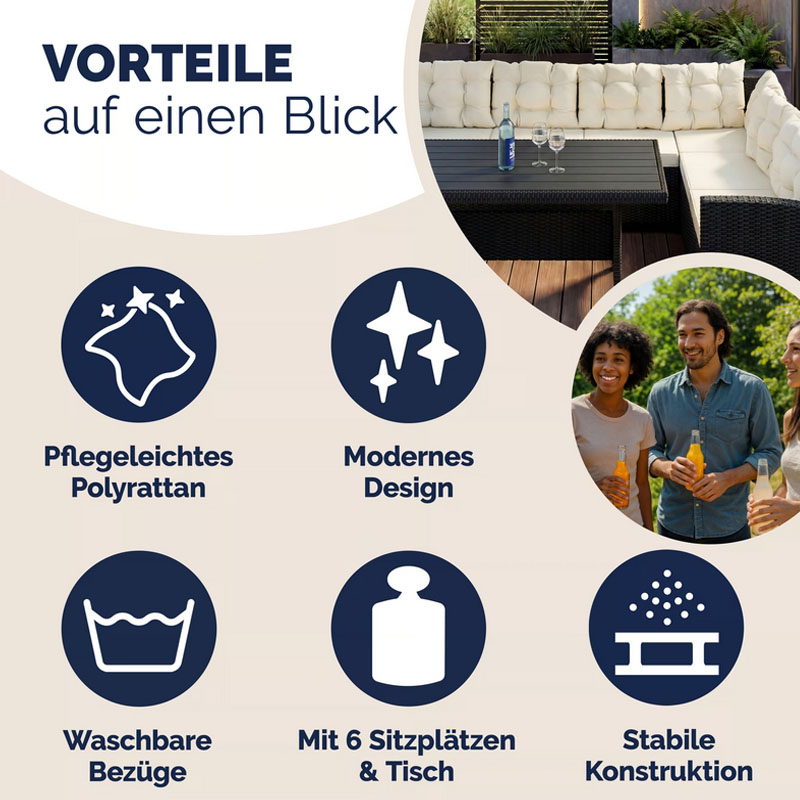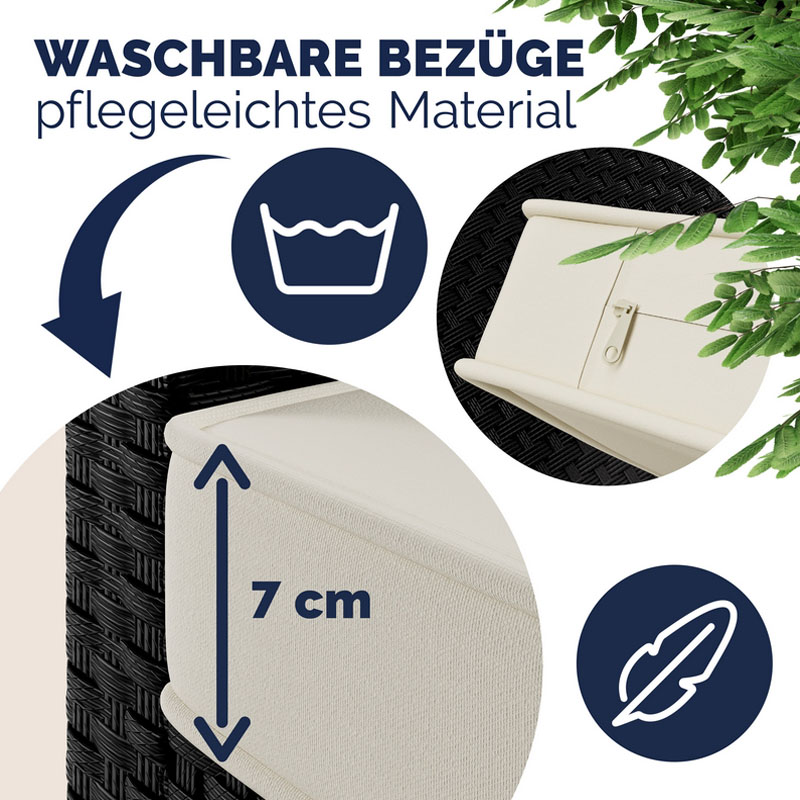 - Extrem wartungsarm: Dank des galvanisierten Stahlrahmens und des wetterfesten Polyrattans ist die Lounge auf hohe Beanspruchung und Langlebigkeit ausgelegt.