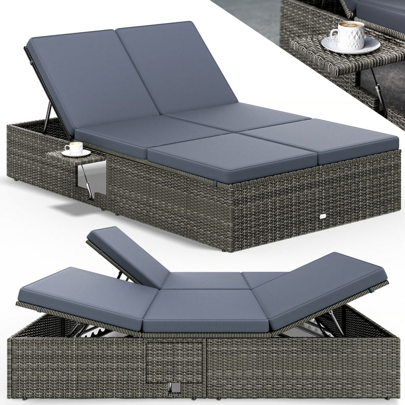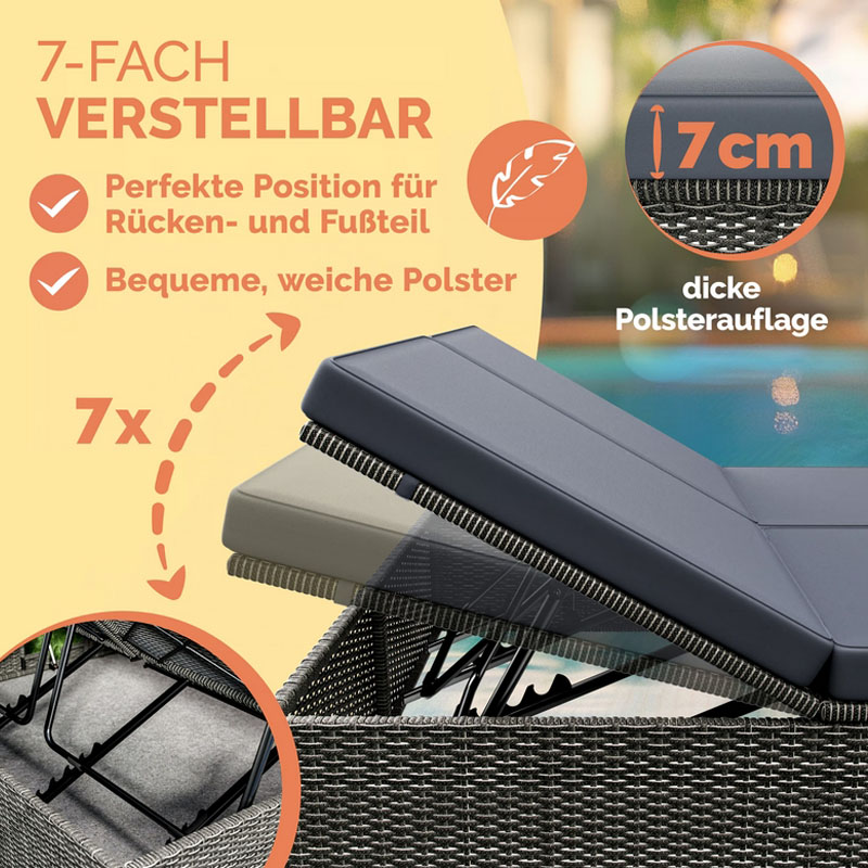 Die Rücken- und Fußteile sind in 7 Wohlfühl-Positionen verstellbar, sodass Sie immer die optimale Liegeposition finden können. Die beiden ausklappbaren Tische (jeweils 30 x 20 cm) sind perfekt für Getränke und Zeitschriften. Die 7 cm dicke Polsterauflage sorgt für zusätzlichen Liegekomfort und ist pflegeleicht; die Bezüge können bei 30°C gewaschen werden.
