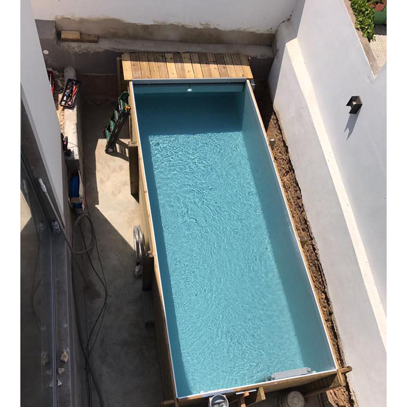 Sie erhalten den Pool mit einer geteilten Einbauleiter aus Aluminium/ABS mit 3 Stufen. Im äußeren Bereich befindet sich eine 4 stufige Holzleiter, sodass Sie schnell und einfach in bzw. aus Ihrem Pool gelangen können.